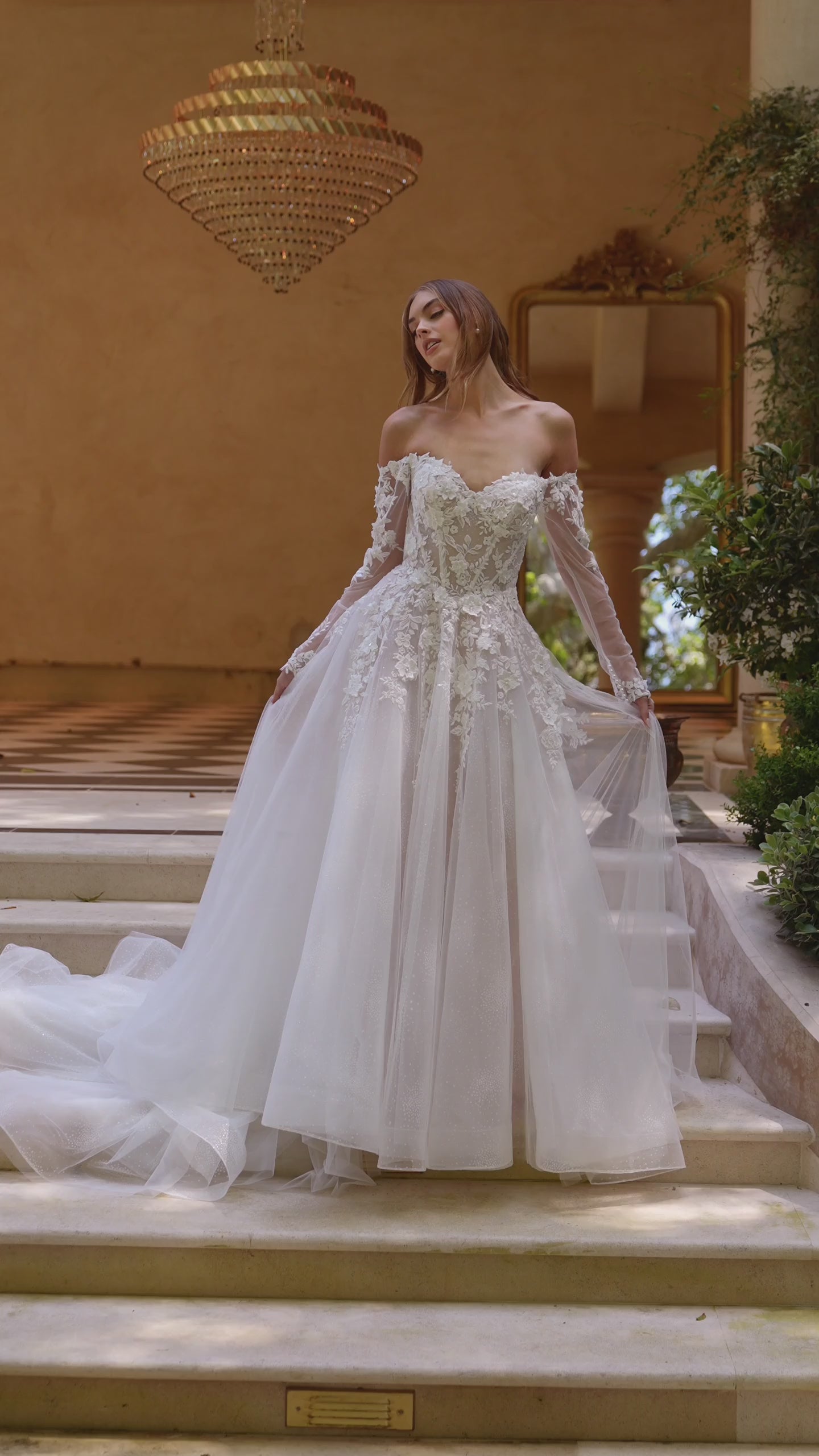 Soft, romantic and elegant, this romantic ball gown evokes fairytale elegance with its dreamy silhouette and intricate detailing. The gown features an off-the-shoulder neckline with sheer illusion sleeves and a corseted bodice adorned in hand-placed floral appliqués. Layers of glittered tulle cascade into a soft, voluminous skirt, adding shimmer and graceful movement to every step. Designed for the modern bride seeking both romance and sophistication, this gown blends timeless charm with delicate couture accents. Refined sophistication for your most unforgettable memories.