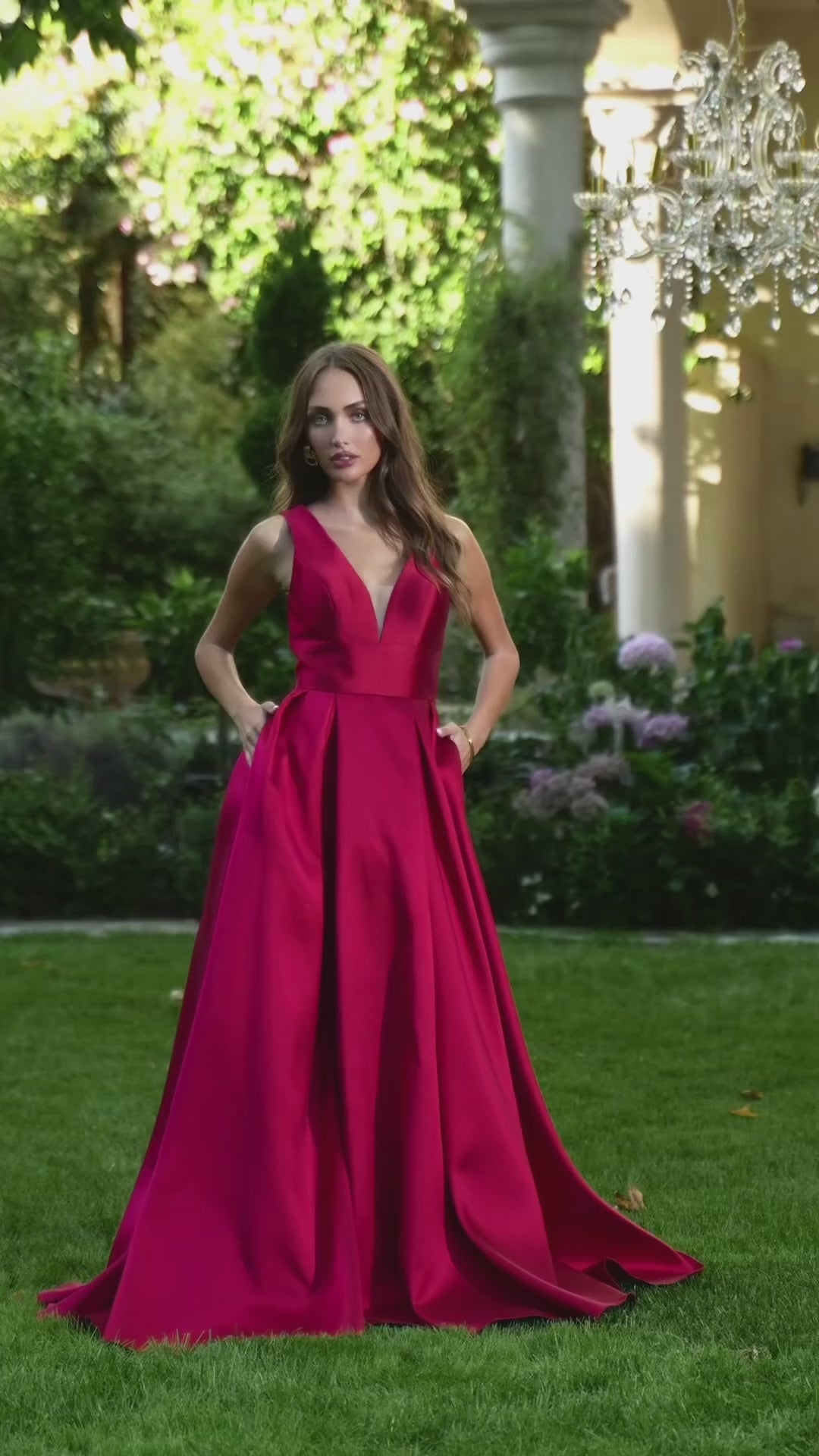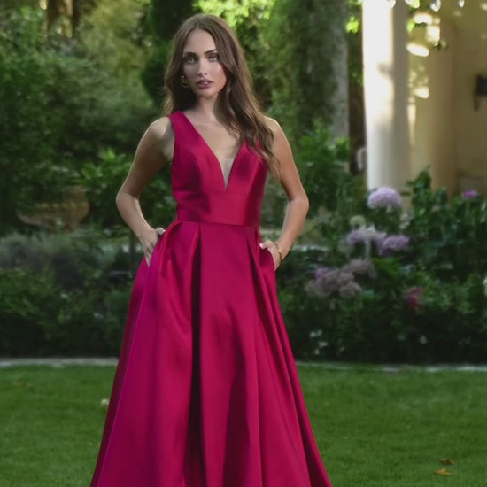 This vibrant ballgown designed to captivate attention was designed to let you own the spotlight. The sleeveless silhouette features a deep plunging neckline with a sheer modesty inset, balanced by a structured box-pleated skirt. In-seam pockets add modern functionality, while the V-back with zipper closure ensures a sleek finish. Perfect for galas, weddings, or milestone celebrations, Amoris by Ladivine T814 blends timeless elegance with contemporary charm. Because every entrance should fell unforgetable